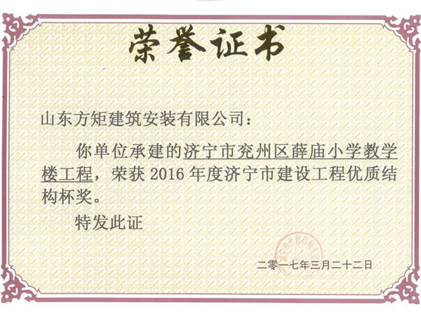 兗州區(qū)薛廟小學教學樓工程優(yōu)質結構杯獎